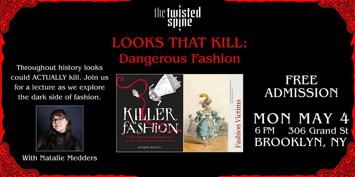 Natalie Medders joins us at The Twisted Spine for her special lecture: LOOKS THAT K*ll. Medders will cover deadly fashion trends throughought history that have stopped people in their tracks, literally. From accidental poisoning to purposeful disfigurement, this lecture follows the path from the runway to the grave.