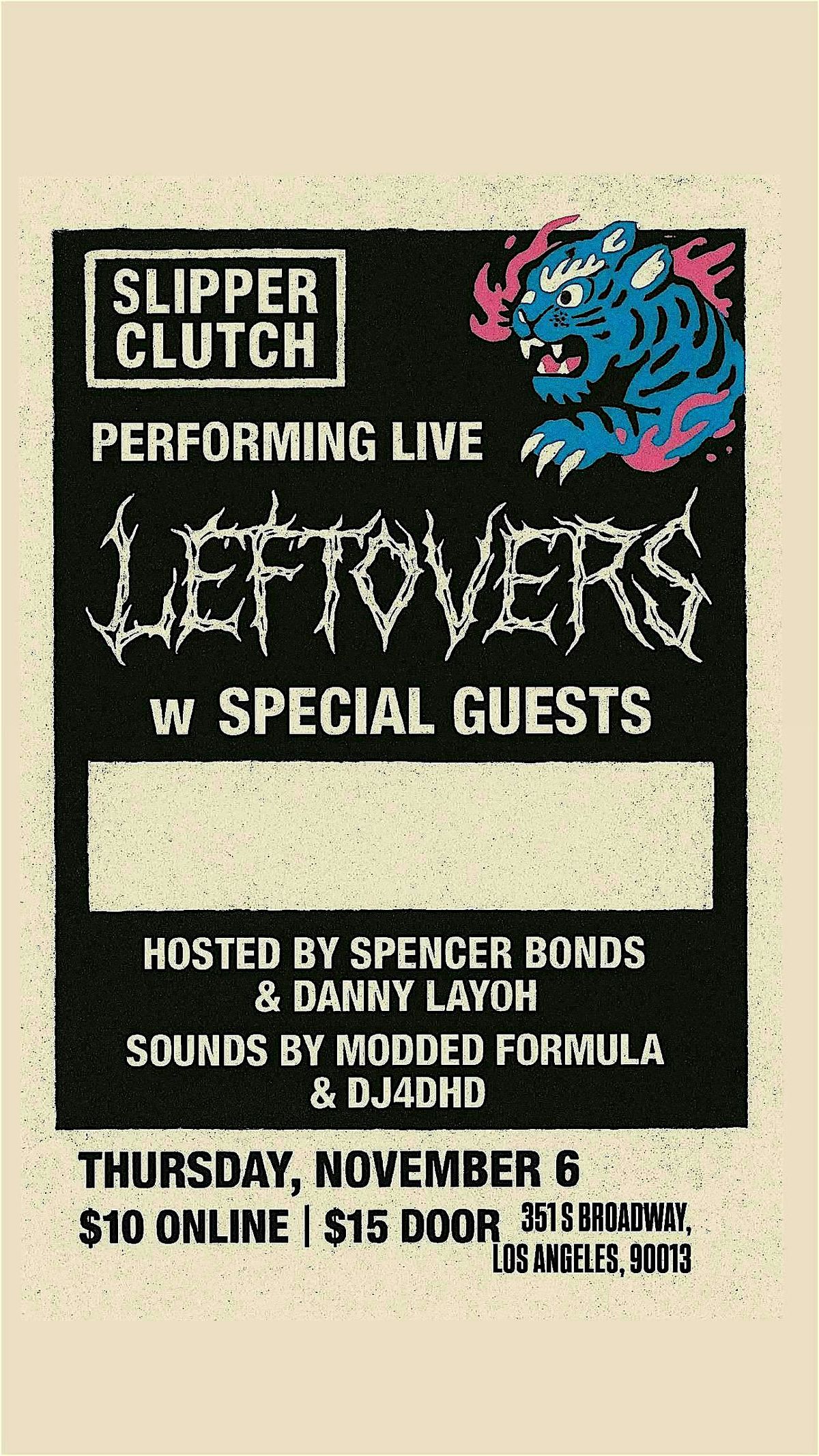 Come join us for a night of fun at The Slipper Clutch! Get ready to dance, mingle, and enjoy some delicious drinks with friends. This event is all about good vibes and great company. So, grab your crew and let's make some memories together. Don't miss out on the LEFTOVERS DTLA PARTY!