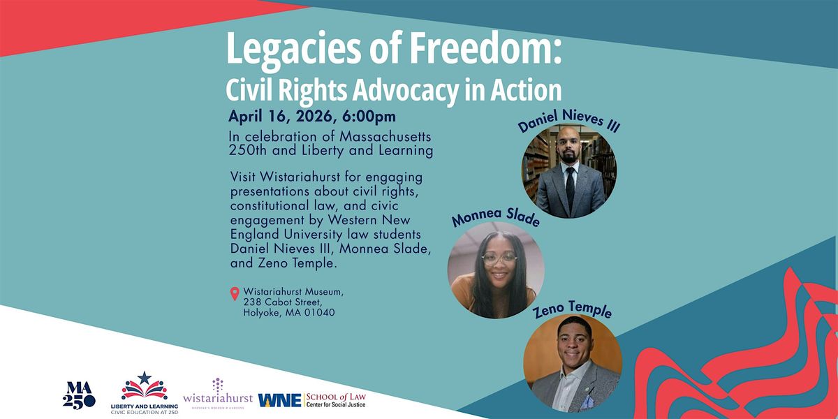 Wistariahurst Museum is excited to welcome law students from Western New England University School of Law's Center for Social Justice for Legacies of Freedom: Civil Rights Advocacy in Action. This community event, featuring presentations about various topics by three law students at Western New England University School of Law, is organized by the school’s Center for Social Justice and Outreach and Diversity Committee's Justice Riders program.
