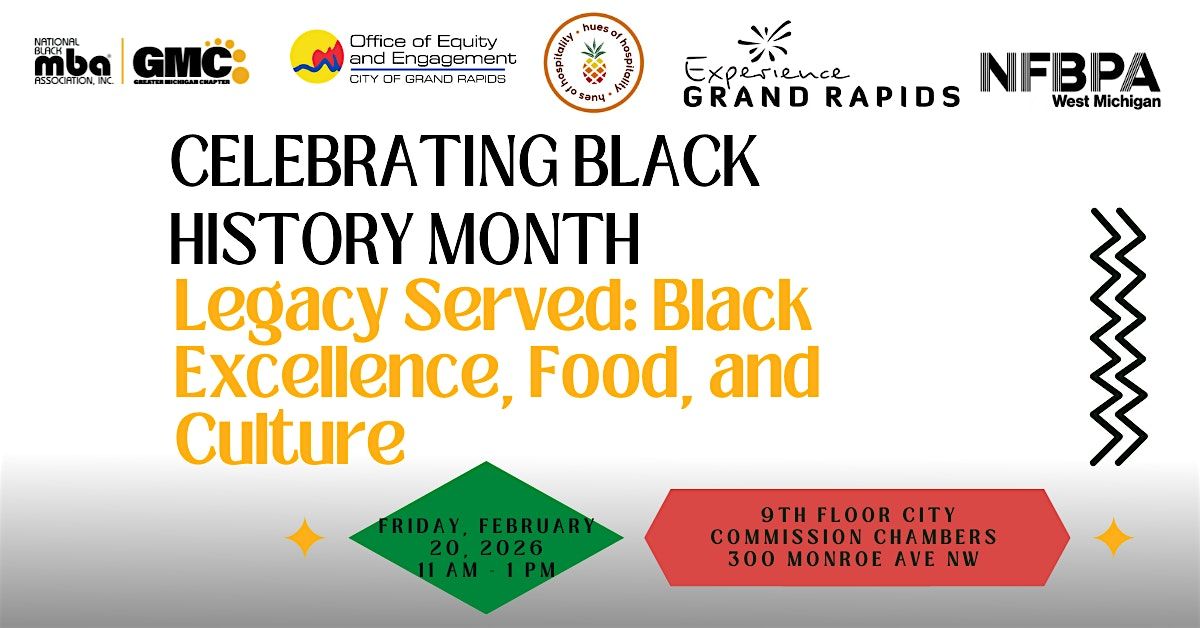 Welcome to Legacy Served: Black Excellence, Food, and Culture! Join us at 300 Monroe Ave NW on February 20, 2026, at 11:00 AM (Eastern Time) for a celebration of Black history and culture through delicious food and engaging activities. Let's come together to honor the achievements and contributions of the Black community. Don't miss out on this opportunity to connect, learn, and enjoy amazing cuisine. See you there!