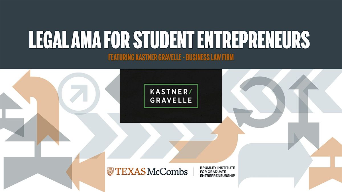 At this AMA event hosted by Brumley Institute for Graduate Entrepreneurship, UT students with legal questions regarding their business ventures can ask associates from Kastner Gravelle, a business law firm here in Austin, Texas. Below are some of the topics they specialize in. Lunch will be provided. Students will be able to schedule one on one office hours with Kastner Gravelle employees after the event.