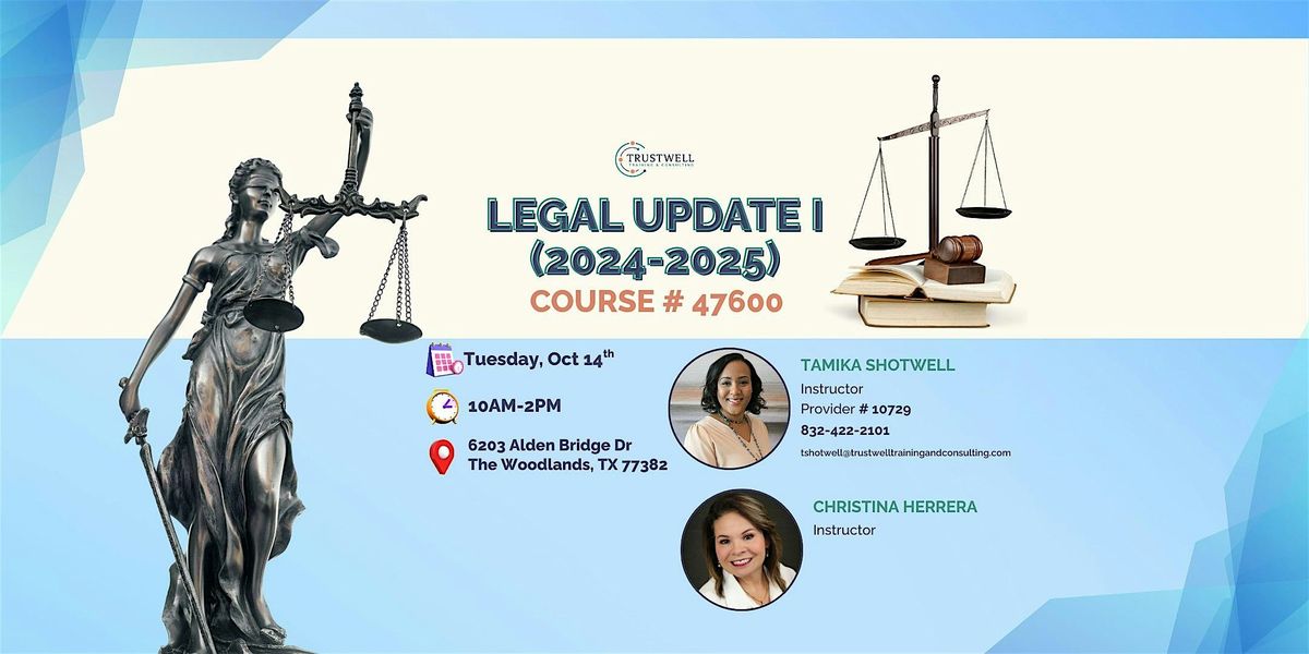 The course covers: Legislative Changes and TREC Rule Updates, Promulgated Contract Forms and Addenda, Fair Housing, Landlord-Tenant Issues.