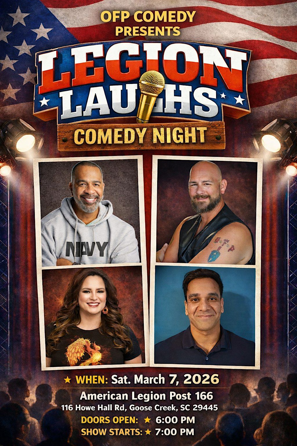 Join us in person for a night packed with laughs and good vibes. Legion Laughs Comedy Night is your ticket to hilarious stand-up, great company, and unforgettable moments. Bring your friends, grab a seat, and get ready to chuckle, giggle, and guffaw until your sides hurt. Don’t miss out on the fun — it’s gonna be a blast!