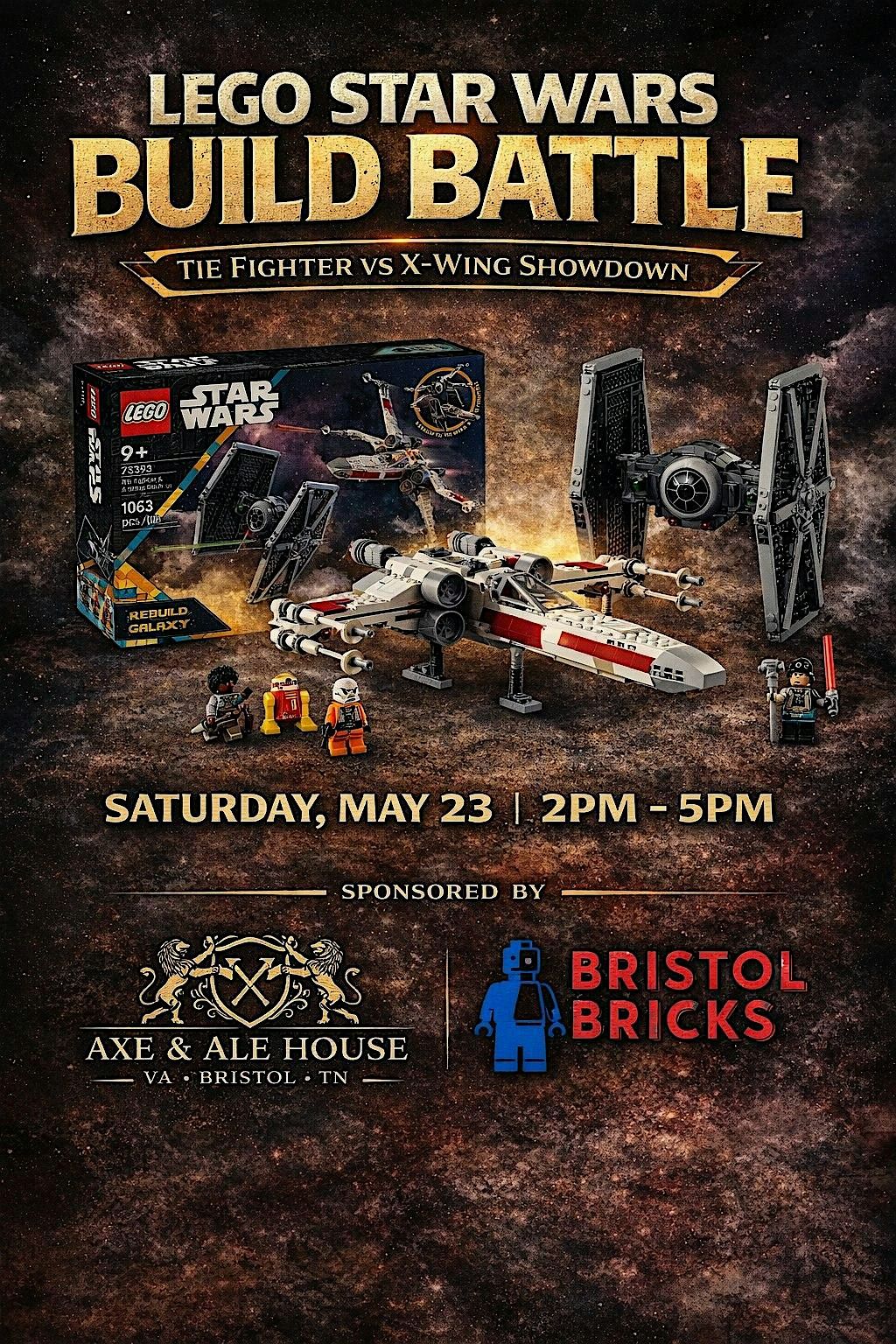 Join us for a high-energy LEGO Star Wars Build Battle where teams compete to assemble the TIE Fighter & X-Wing Mash-Up set (1063 pieces) as quickly and accurately as possible.