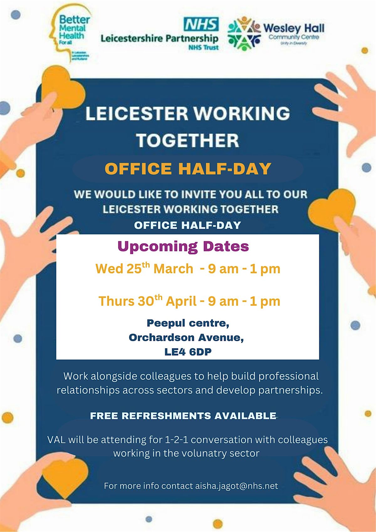 Leicester Working Together Office Half-Day on Wednesday 25 March 2026, 9am – 1pm at The Peepul Centre, Orchardson Avenue, Leicester LE4 6DP. This is a great opportunity to network with colleagues from across Leicester City, help build strong working relationships and develop partnerships for those working in the mental health, health and wellbeing sector. The office half-day will allow you to continue your every-day work and a chance for you to link in with those around you i.e. colleagues, community organisations, NHS, statutory organisations.