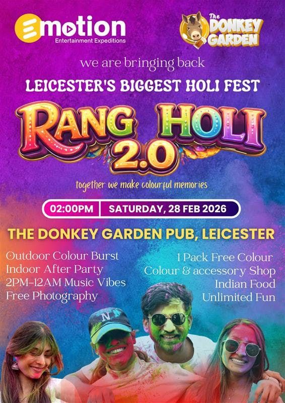 Venue: The Donkey Garden, Leicester's Iconic PubDate: February 28, 2026Time: 2:00 PM - 6:00 PM (Outdoor Holi Festival)Afterparty Bollywood Night: 6:00 PM onwardsWe are bringing back Leicester's vibrant 2 in 1 Rang Holi celebration at The Donkey Garden! Experience the joy of Holi, the festival of colors, in a lively outdoor setting from 2:00 PM to 6:00 PM. Safe, organic colors will be provided for all participants, ensuring a fun and safe celebration. One Complimentary Colour packet provided at the Gate