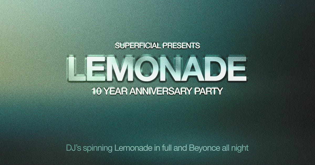 🍋 HOLD UP! 10 YEARS OF LEMONADE? 🍋 It's been 10 years since Beyoncé graced us with Lemonade. Superficial DJ’s will be spinning Lemonade in full plus all your fav Bey tracks all night long.
