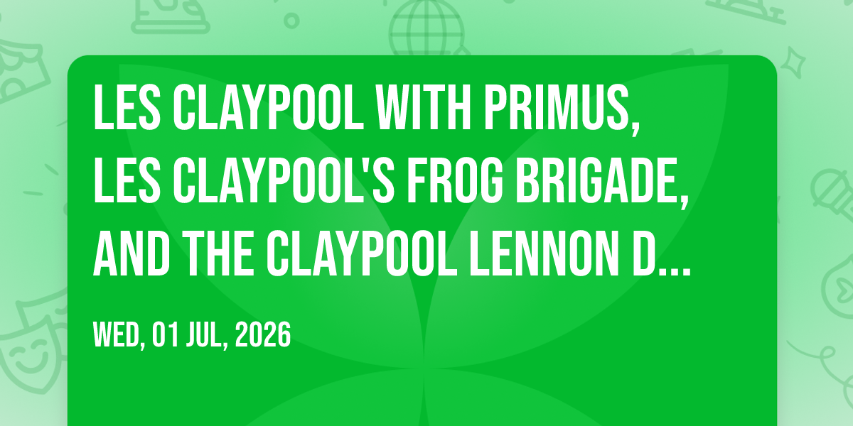 📍 Location: 33.4489, -112.079🌟 Be part of history at Les Claypool with Primus, Les Claypool's Frog Brigade, and The Claypool Lennon Delirium, an extraordinary gathering that will captivate your imagination! 🏛️ The prestigious Arizona Financial Theatre in Phoenix, AZ sets the stage for an unforgettable experience on July 1st, 2026 at 03:00 AM. ✨ They are bringing together the finest elements of entertainment and innovation to create moments that will take your breath away. From the moment you arrive, you'll be immersed in an atmosphere of wonder and excitement. 🎯 This carefully planned event ensures every guest experiences something truly special. 🎊 Early booking is recommended for this must-attend event of the season!