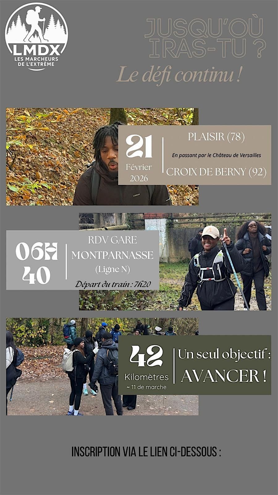 Le samedi 21 février 2026, le parcours reliera Plaisir (78) à la Croix de Berny (92), en passant par le Château de Versailles. Une distance de 42 kilomètres, soit environ 11 heures de marche, avec un seul objectif : avancer.
