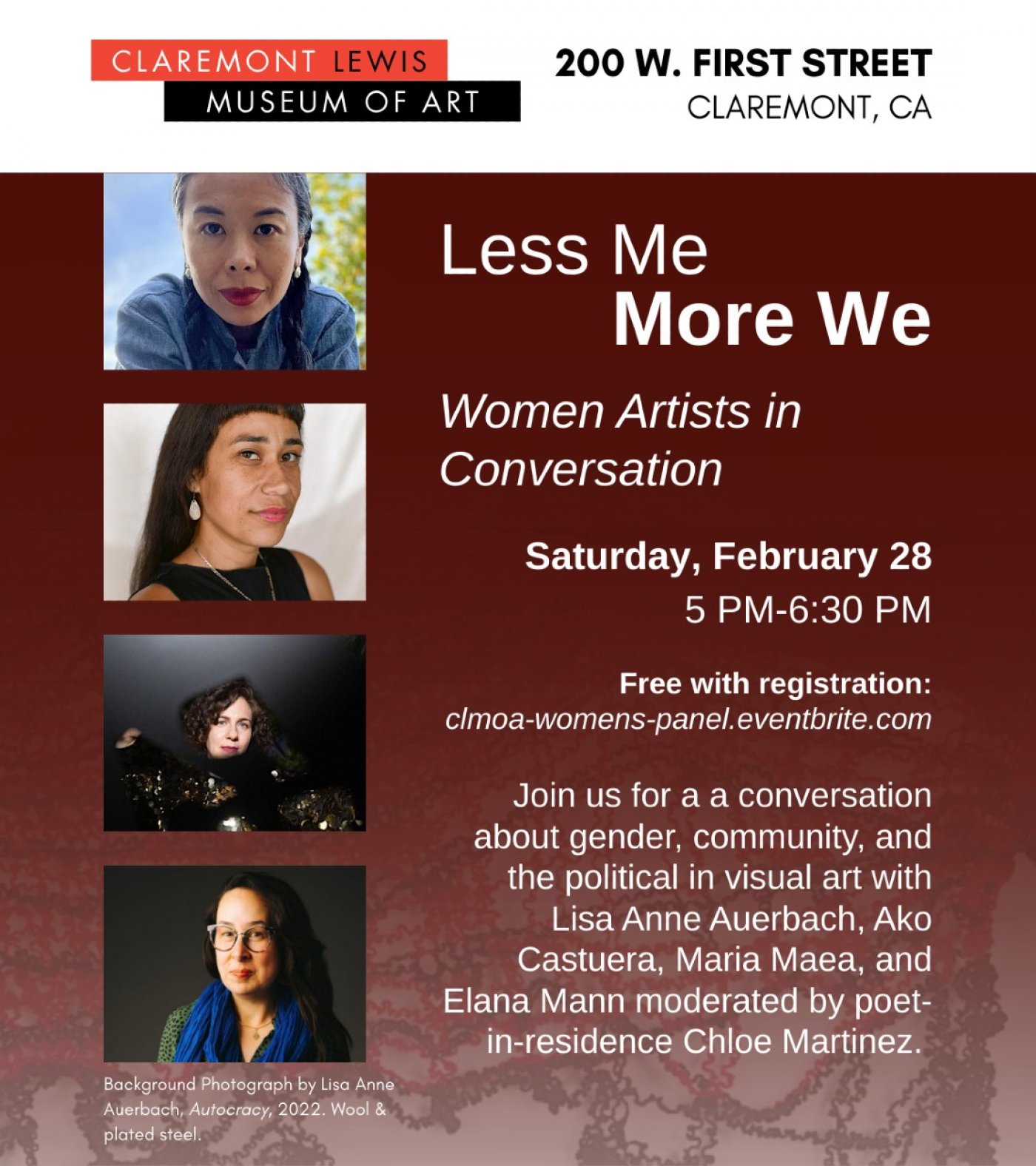 Join us for a a conversation about gender, community, and the political in visual art with Lisa Anne Auerbach, Ako Castuera, Maria Maea, and Elana Mann moderated by poet-in-residence Chloe Martinez.