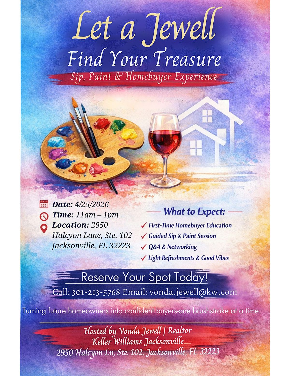 Your first home is waiting—and your journey starts here! Join Vonda Jewell for a unique Sip & Paint Homebuyer Experience, where learning meets creativity.