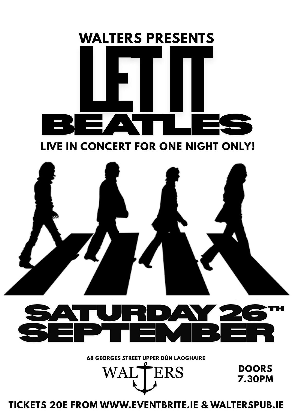 Performing all the legendary Beatles hits live in concert for one night only at Walters intimate venue Dun Laoghaire!