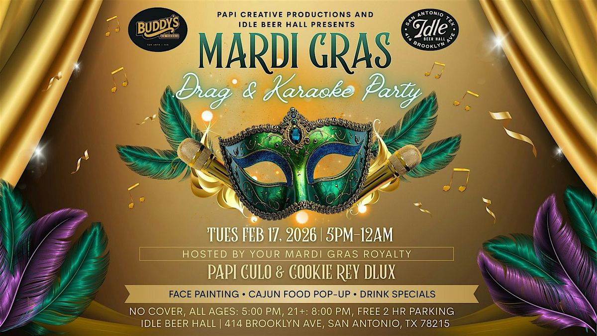 Join us for a Fat Tuesday celebration that brings together drag, karaoke, music, specialty drinks, food, and the life of Mardi vibes in one unforgettable night. Hosted by Idle's Mardi Gras Drag King and Queen - Papi Culo & Cookie Rey D'Lux!