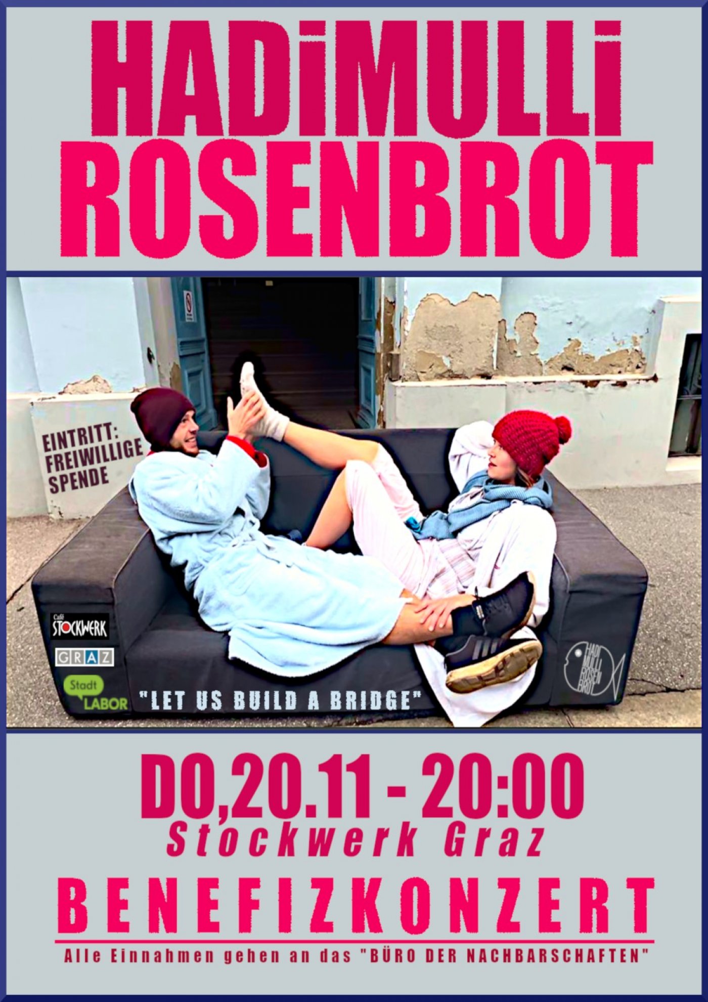 Eintritt: FREIWILLIGE SPENDE - der Reinerlös geht direkt an das "BÜRO DER NACHBARSCHAFTEN" weil wir finden was dort passiert ist wertvoll und gehört unterstützt!
