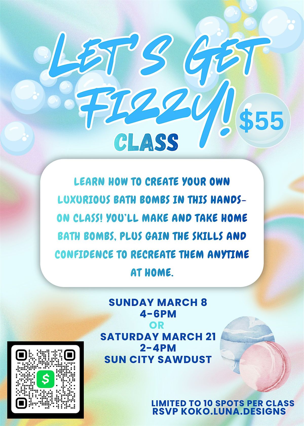 Ready to add some sparkle to your bath time? Join our in-person Let's get Fizzy! Bath bomb Class where you'll learn how to create your own colorful, fragrant bath bombs. It's hands-on, fun, and perfect for relaxing or gifting. Bring your creativity, and let's make your bath fizz-tastic together!