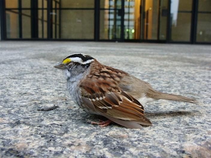 Photo credit to Sara Scharf: "White throated sparrow, a migratory bird species, stunned after hitting a window".