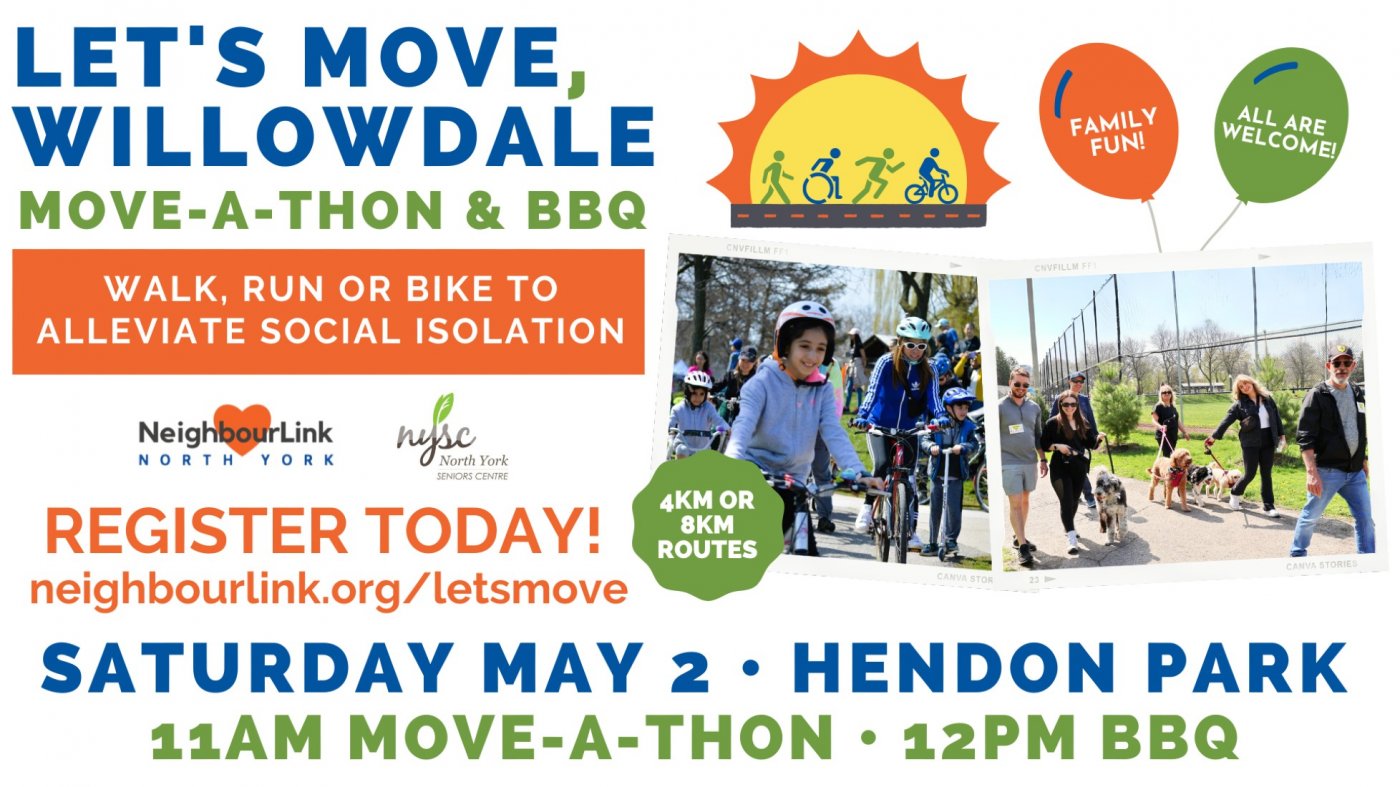 Join NeighbourLink North York's 5th Let’s Move, Willowdale Move-a-thon & BBQ in partnership with the North York Seniors Centre (NYSC) on Saturday, May 2nd!