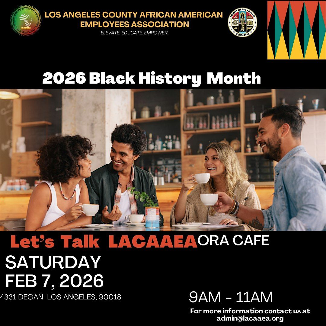 The Los Angeles County African American Employees Association (LACAAEA) members will explore the modern cultural center for African American arts, music, spoken word, and community - LEIMERT PARK VILLAGE. Join us for a cup of coffee and tea, as we support a Black business while discussing our history. This is a networking opportunity, casual conversations and comfortable sharing before walking down to Art & Practice to view their exhibits. This is a family friendly invite. Everyone is welcomed!