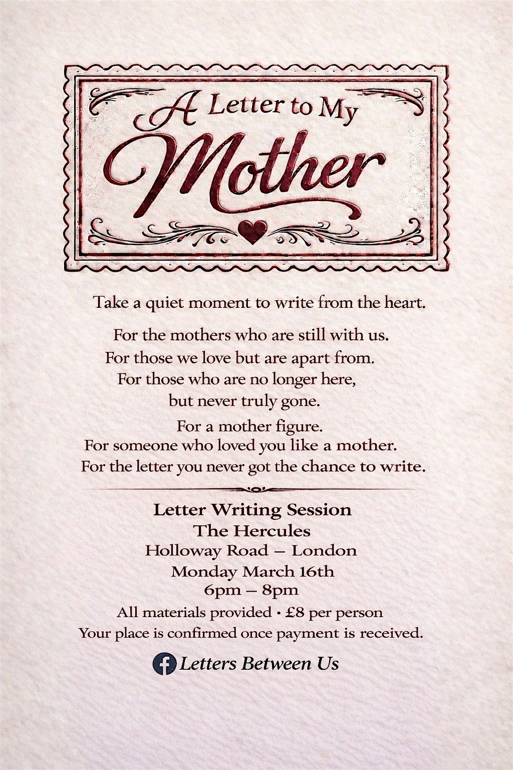 A gentle, reflective letter-writing session inviting you to write to your mother — in whatever way feels right for you. For the mothers who are still with us. For those we love but are apart from. For those who are no longer here, but never truly gone. For a mother figure. For someone who loved you like a mother. For the letter you never got the chance to write. This is a quiet, welcoming space with all materials provided. No writing experience needed — simply come as you are. 📍 The Hercules, Holloway Road, London 🗓 Monday 16 March 2026 ⏰ 6:00–8:00pm Places are limited to keep the space calm and personal. Hosted by Letters Between Us
