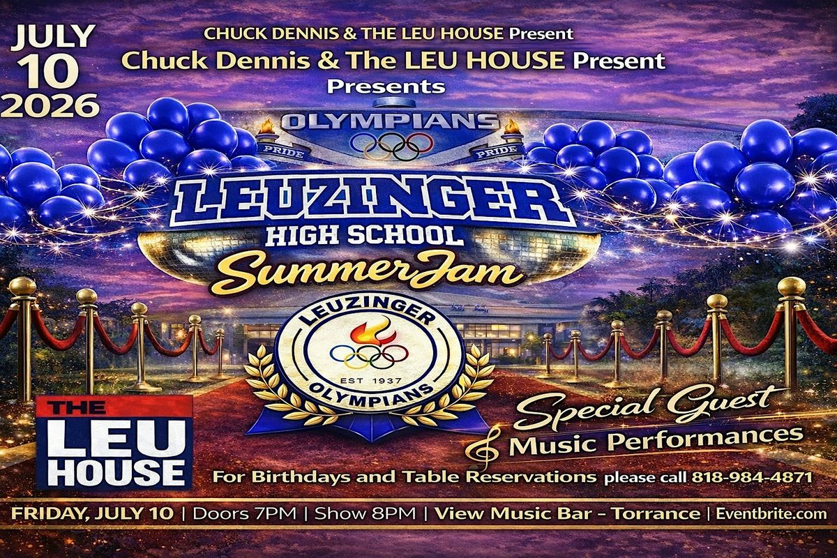 Leuzinger High School Summer Jam is a high-energy celebration bringing Olympians and the community together for an unforgettable night of music, nostalgia, and summer vibes. Hosted by Chuck Dennis & The LEU House with music by DJ Twin, this special event features live performances, great food, and a vibrant atmosphere at View Music Bar in Torrance. Get ready to reconnect, celebrate, and represent Leuzinger pride in style. There is a $20 minimum per person food and beverage requirement, not included in the purchase of a ticket to attend. For birthdays and table reservations, please call (818) 984-4871.
