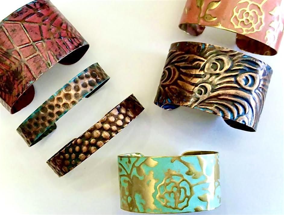 In this class students will create highly textured cuff bracelets in copper and brass. These pieces can either be simple and elegant or bold and dramatic. You’ll learn proper annealing and forming techniques and some unconventional ways to texture metal. Class will also cover both subtle and dramatic patinas and sealing methods.