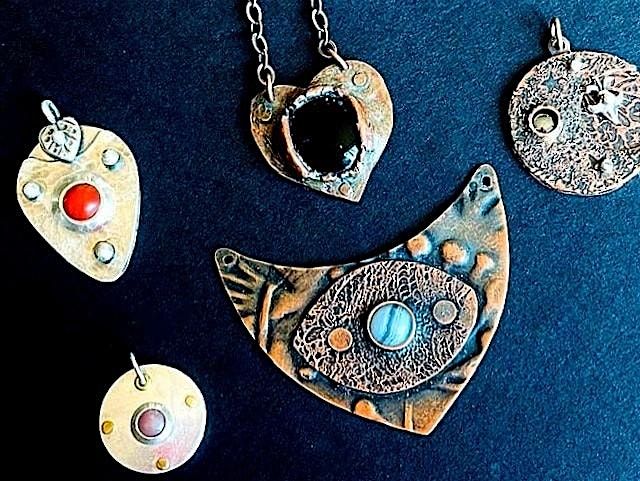 In this 2 part intermediate metals class students will expand basic riveting skills while creating unique, no- solder settings to showcase cabochons or any material with a flat back. This fast paced class covers texturing, piercing, sizing, dapping, and shaping sheet metal as well as several finishing techniques for one-of-a-kind pendants. In class students will work primarily with copper as practice metal. Feel free to bring silver if you prefer. (2 inches by 2 inches in 22 and 24 gauge sheet)