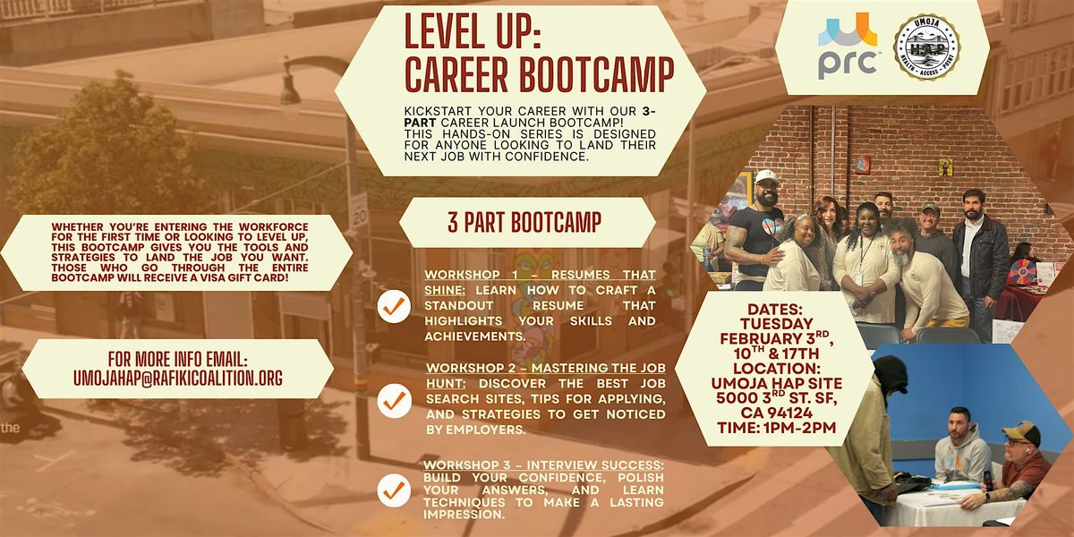 Whether you’re entering the workforce for the first time or looking to level up, this bootcamp gives you the tools and strategies to land the job you want. those who go through the entire bootcamp will receive a visa gift card!
