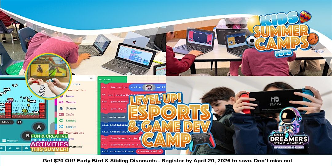 Ready to level up your gaming and coding skills? Join us in person for an epic camp all about esports and game development. Whether you're aiming to become a pro player or a game creator, this is the place to be! Connect with fellow gamers, learn from the experts, and dive into the world of gaming like never before. Don’t miss out on the fun and the chance to power up your passion!