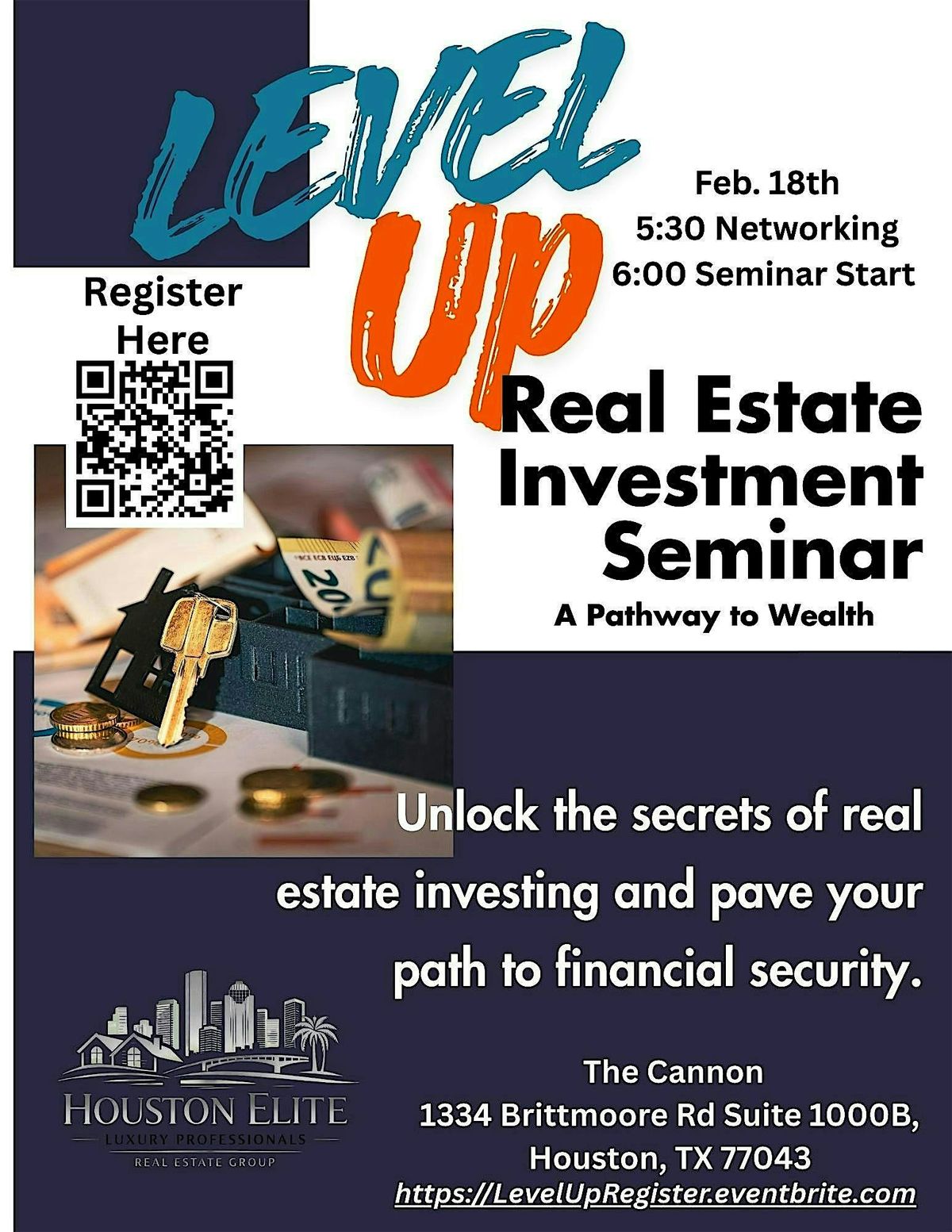 Join us for the Level Up Real Estate Investment Seminar, an engaging evening designed to help you unlock the secrets of real estate investing and build long-term wealth. Network with like-minded professionals starting at 5:30 PM, followed by a powerful seminar at 6:00 PM that outlines practical strategies for financial growth and security. Perfect for both new and aspiring investors ready to take the next step