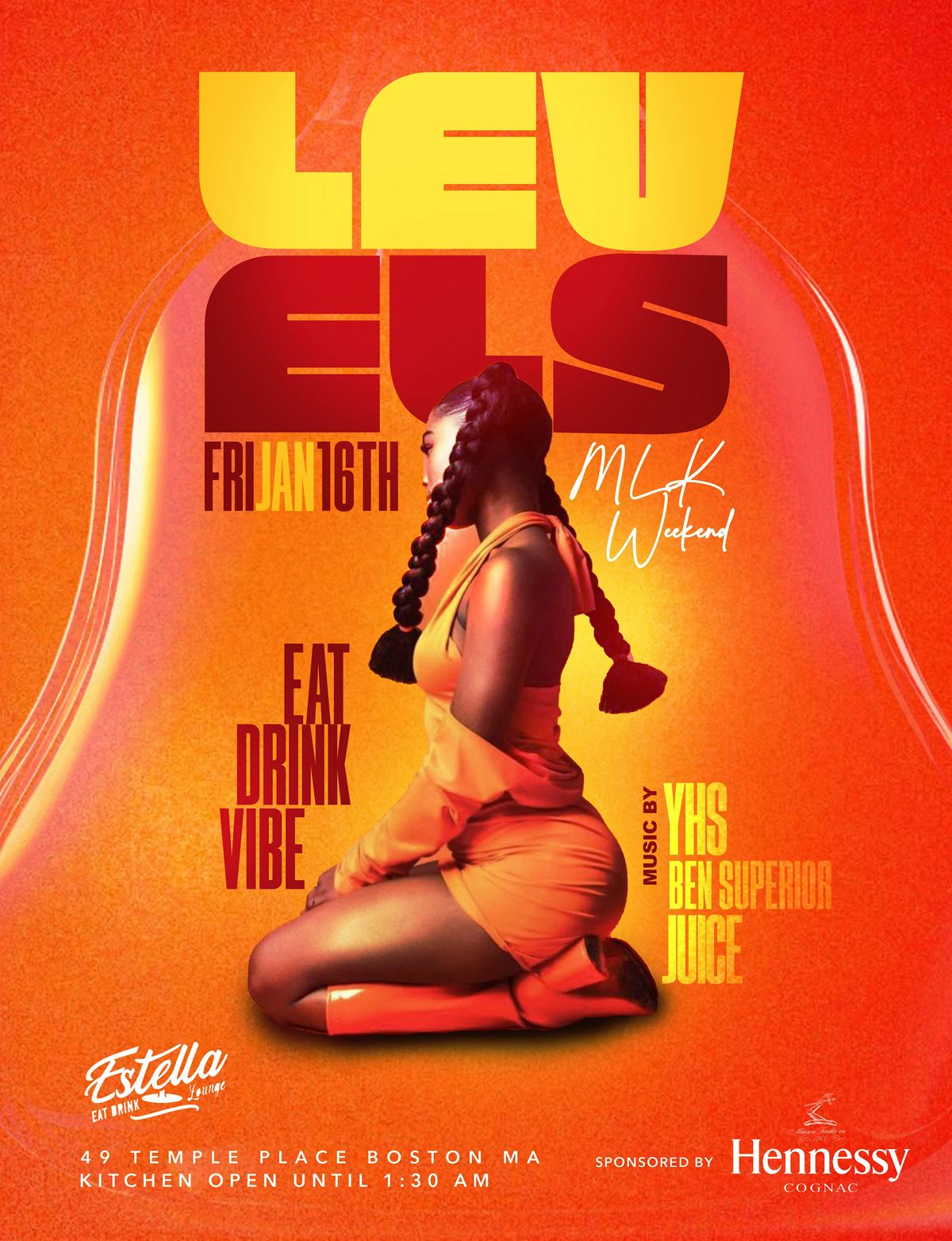 Eat. Drink. Vibe. Levels at Estella. Hip Hop, Afrobeats & Dancehall all night. Sponsored by Hennessy.