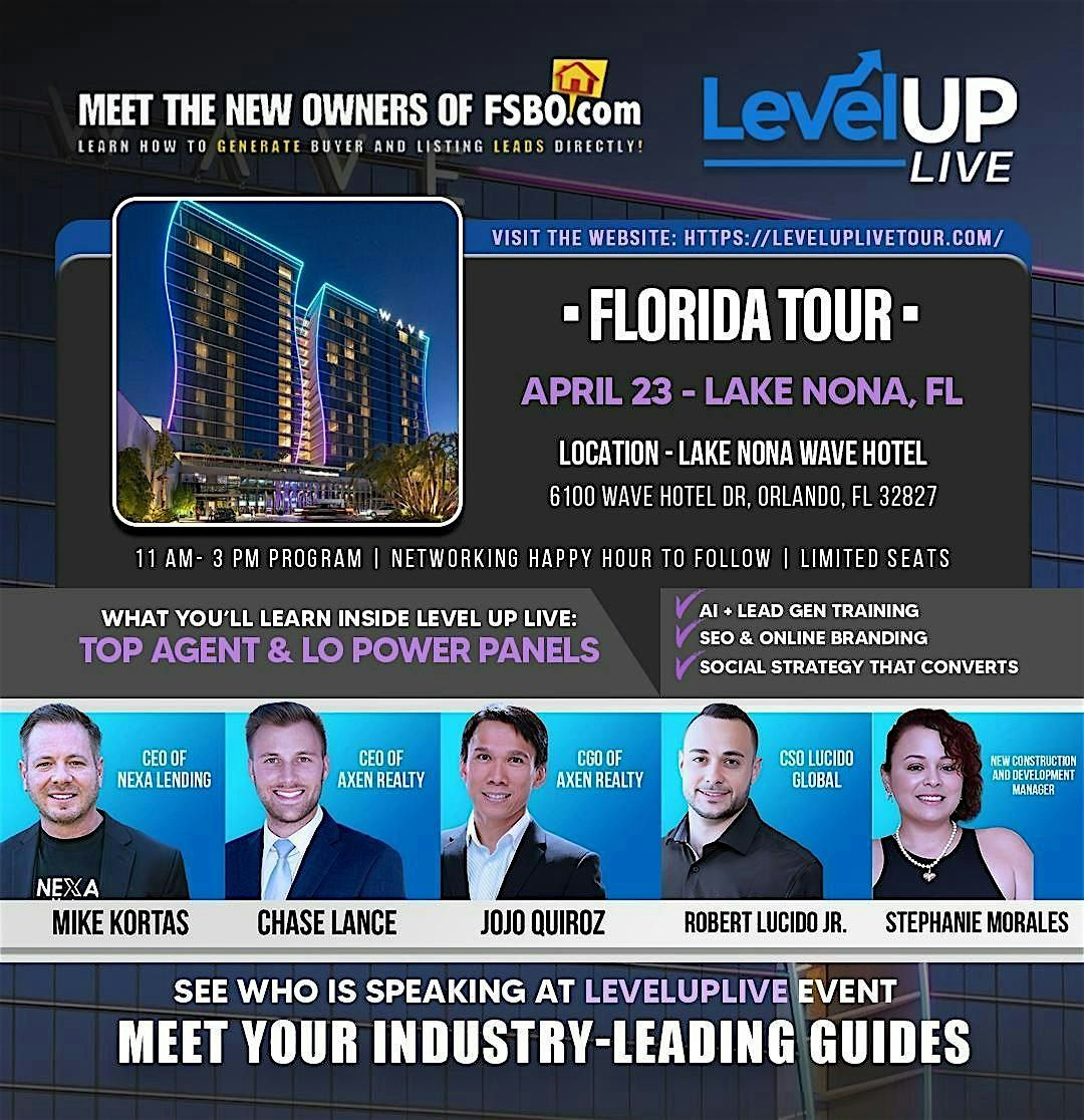 Join us at the Level Up Live - Florida Tour, an exclusive event for real estate professionals, loan officers, entrepreneurs, and career seekers.