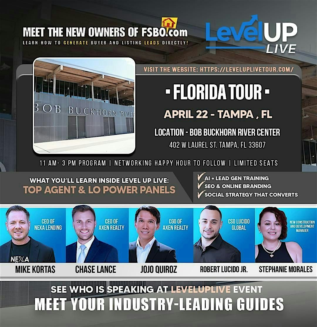 Join us at the Level Up Live - Florida Tour, an exclusive event for real estate professionals, loan officers, entrepreneurs, and career seekers.
