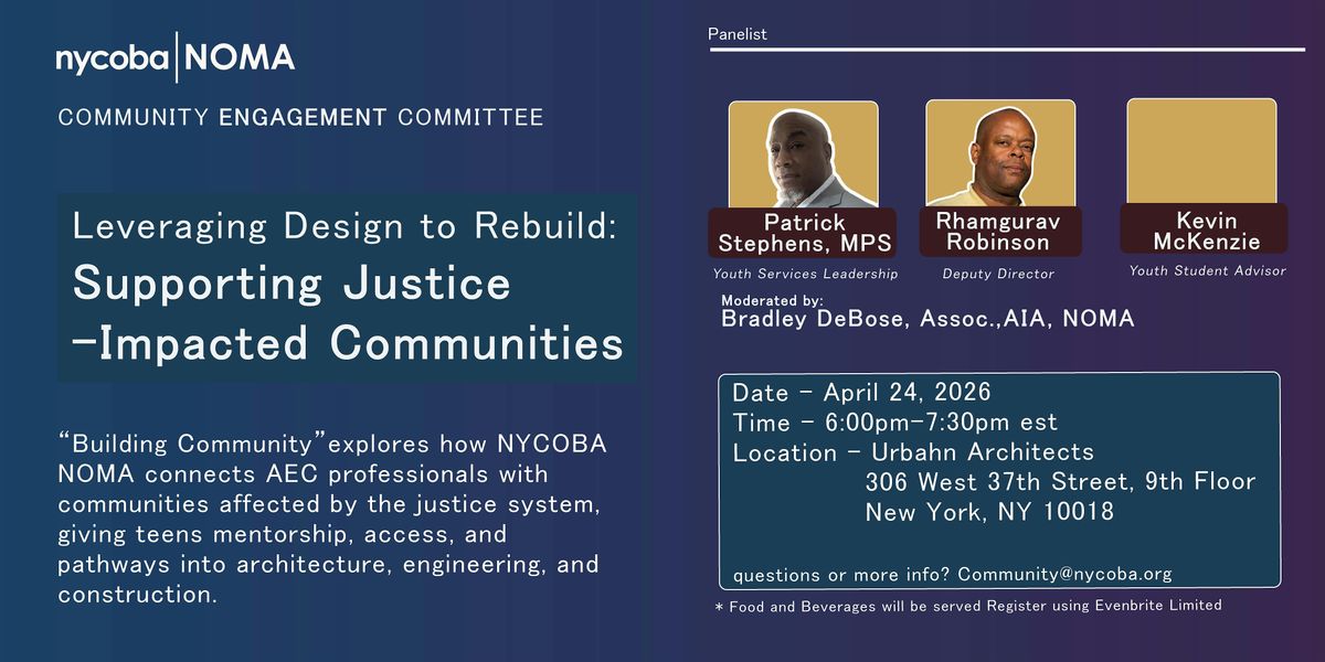 Join NYCOBA NOMA for Building Community, a hybrid event exploring how architecture, engineering, and construction (AEC) professionals can make a meaningful impact in justice-impacted communities. This session introduces a broader initiative focused on mentorship, exposure, and access to the AEC industry for at-risk youth, particularly teenagers, creating pathways to career exploration and long-term engagement.