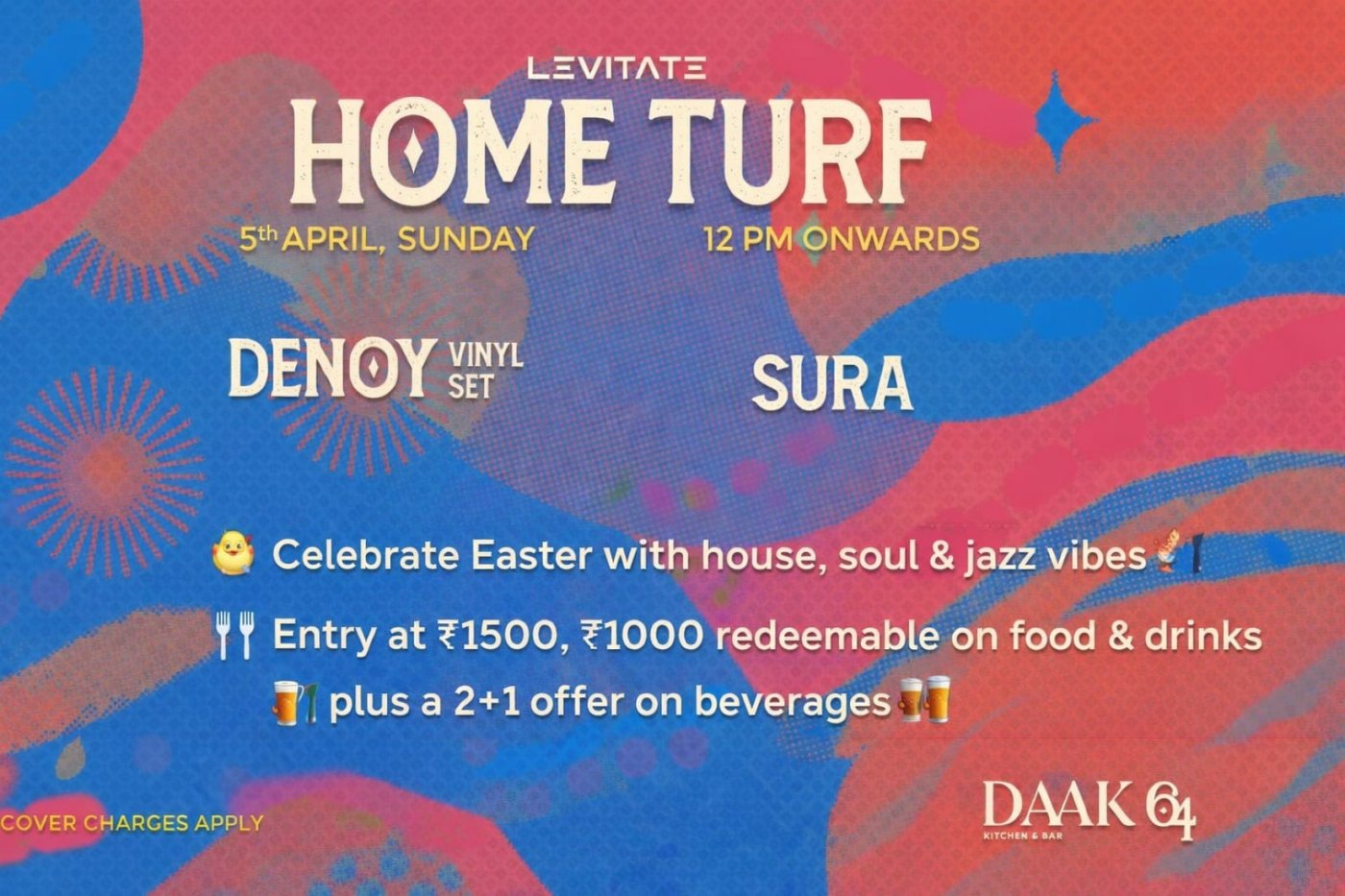 Celebrate Easter at Daak 64 with a vibrant brunch in collaboration with Home Turf โจ Enjoy house, soul & jazz vibes ๐ถ with vinyl sets by Denoy and Sura, paired with a special ร la carte Easter menu ๐ฝ๏ธ