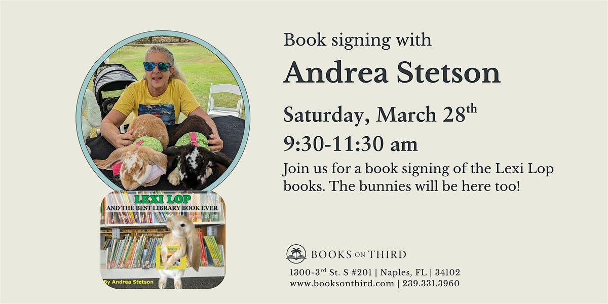 Join us at Books on Third where you can meet and chat with local author, Andrea Stetson. The Lexi Lop bunnies will be here too- just in time for Easter!