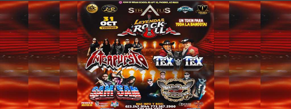 Experience the exciting event 'LEYENDAS del Rock en PHOENIX' at Stratus Event Center, Phoenix, AZ, United States. This must-attend gathering promises an unforgettable experience for all attendees. Join us for a day filled with innovation, networking, and inspiration. Register now to secure your spot at this landmark event. #LEYENDASdelRockenPHOENIX #event #exciting #PhoenixEvents #AZEvents