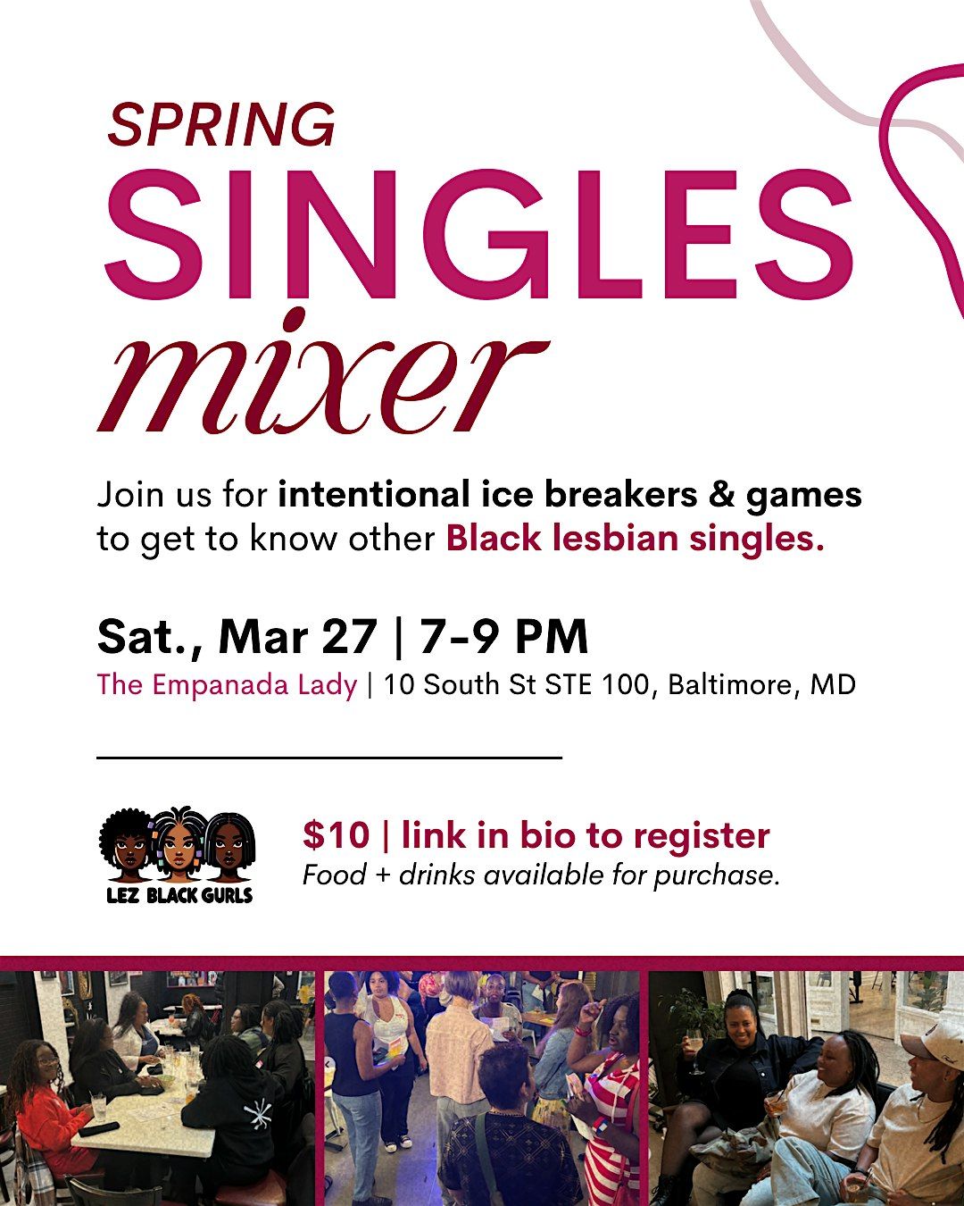 Come join us at The Empanda Lady for a night of fun and mingling at our Singles Mixer! Whether you're looking for love or just want to make new friends, this event is perfect for LGBTQ+ singles in the area. Enjoy food, drinks, and great company in a welcoming and inclusive atmosphere. Don't miss out on the chance to connect with other like-minded individuals and had a good time together. See you there!