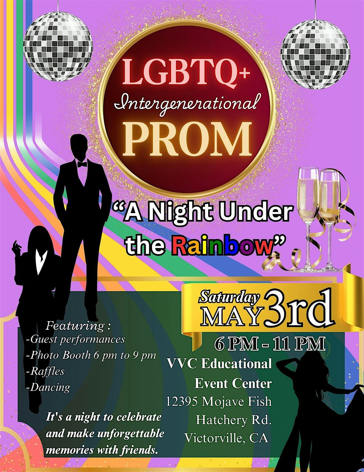 Welcome to the LGBTQ+ Intergenerational Prom! Join us at the Educational Event Center for a night of celebration and inclusivity. This event is a chance for all members of the LGBTQ+ community, regardless of age, to come together and dance the night away. Whether you're young or young at heart, everyone is welcome to attend. Get ready to dress up, hit the dance floor, and make memories that will last a lifetime. Don't miss out on this special evening of love, acceptance, and fun!
