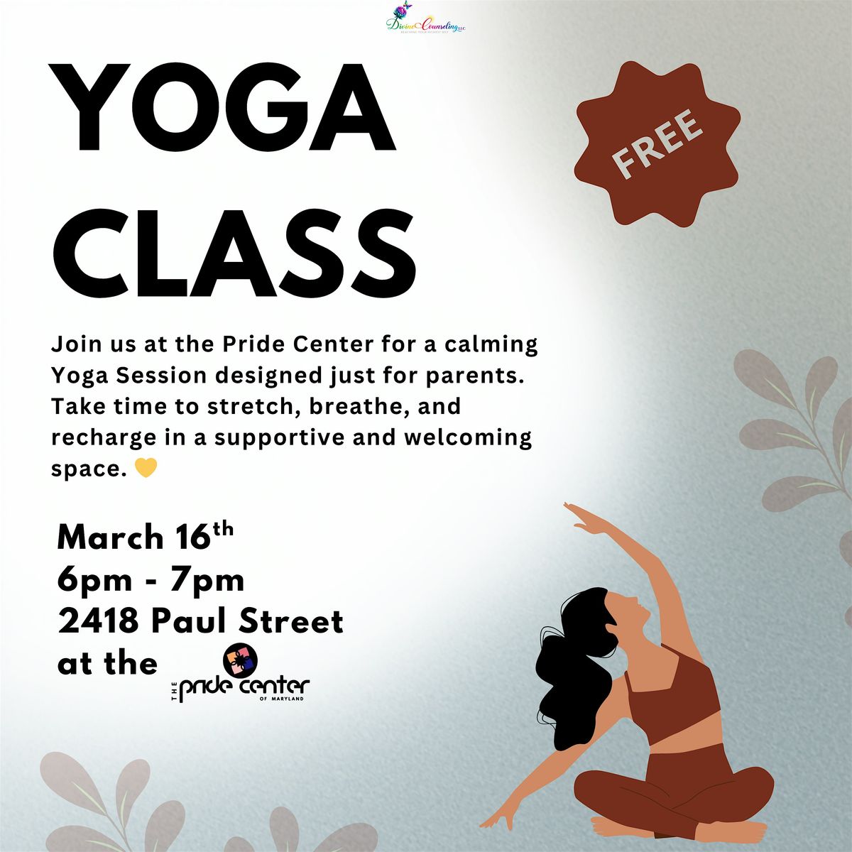 Join us at the Pride Center of Maryland for a yoga session designed for parents. Stretch, breath, and recharge in a supportive space.