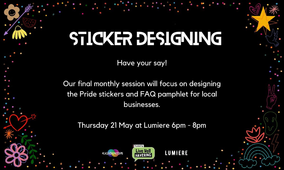 Scope out is a series of creative events for the LGBTQ+ community aged 25 and over with the goal to co-design a queer-led legacy for Romford! We want to make Romford more colourful and inviting by placing small welcoming stickers, indicating that the LGBTQ+ community are safe here. We also want to accompany this with a pamphlet for businesses to spot and act on homophobic incidences.