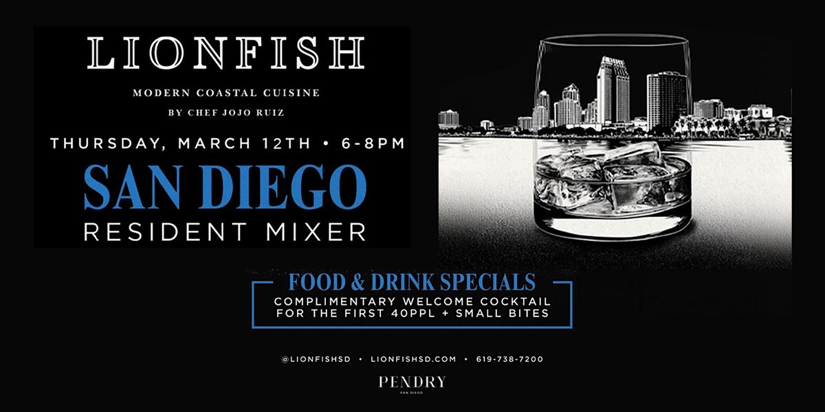 Join us Thursday, March 12th for the San Diego Resident Mixer at Lionfish, located inside the Pendry San Diego, from 6:00PM – 8:00PM!