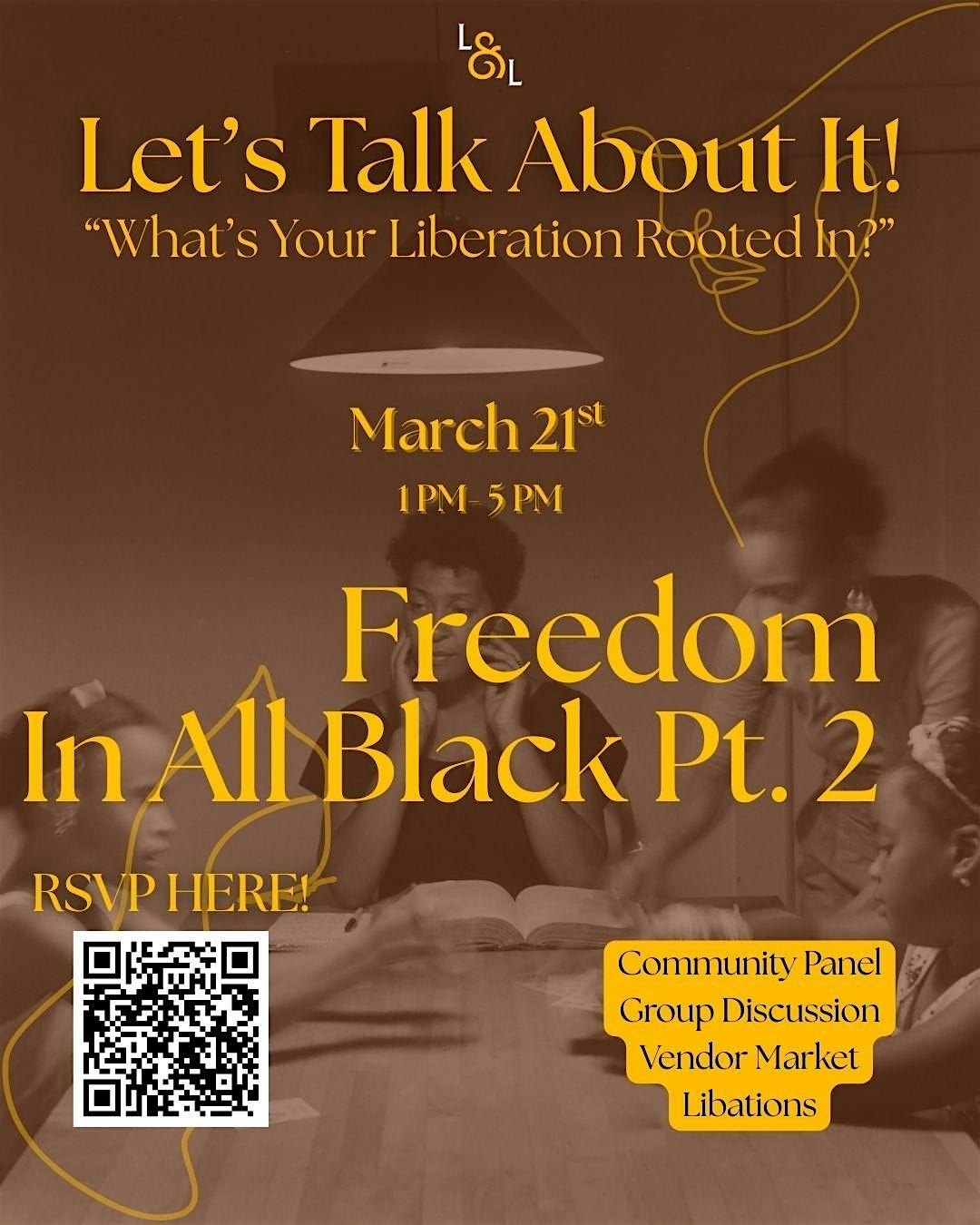 At this gathering, we're discussing "What is your Freedom Rooted in?" We will have open discussion, an activity, a Mini Marketplace, Libations, and Eats.