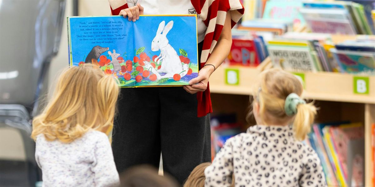 Image: A library staff member holds an open picture book in front of a group of seated children.