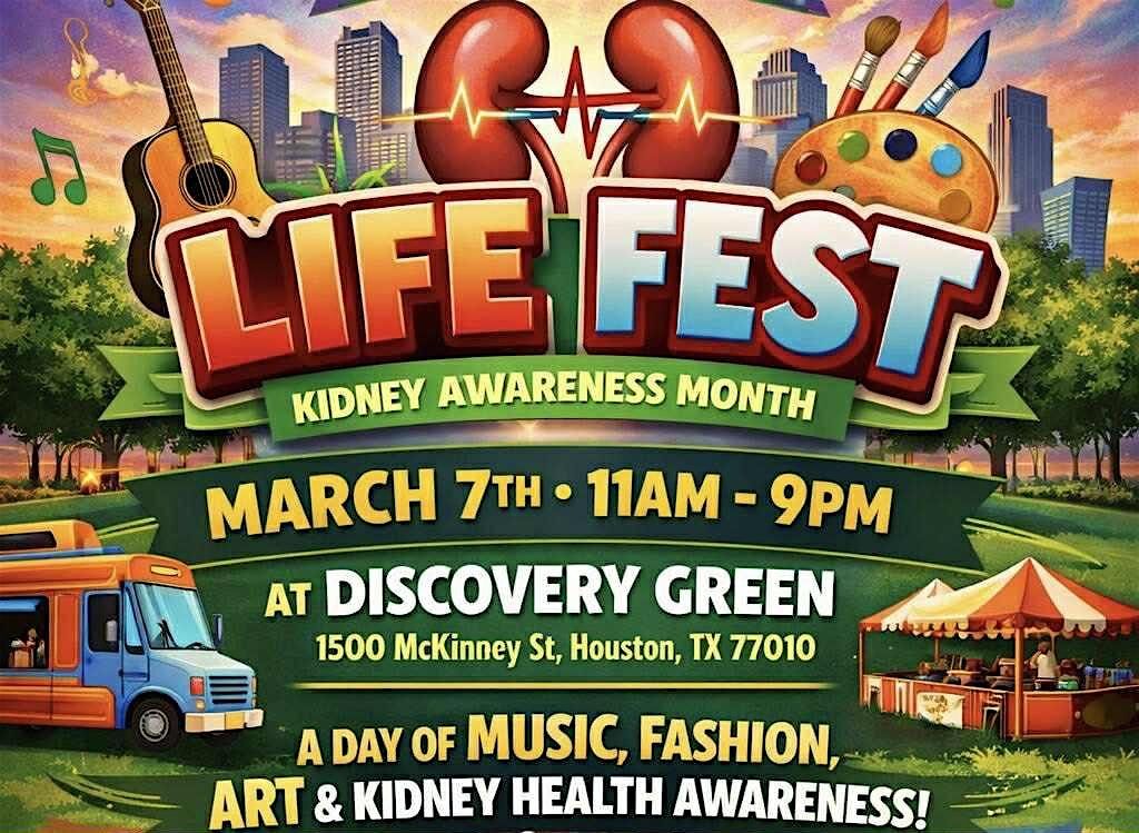 Life Fest — the Kidney Health Awareness Festival — is happening Saturday, March 7, 2026, from 11 AM to 9 PM at Discovery Green in downtown Houston!