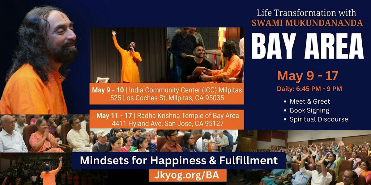 Join us for an inspiring journey toward inner peace and joy with world-renowned spiritual leader Swami Mukundananda. We are thrilled to welcome Swamiji back to the Bay Area from May 9th β 17th for a powerful series on "Mindsets for Happiness & Fulfilment."