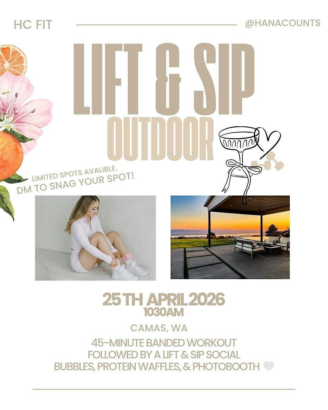 Includes: Workout, waffle, mimosa, jucie shot, photobooth.
