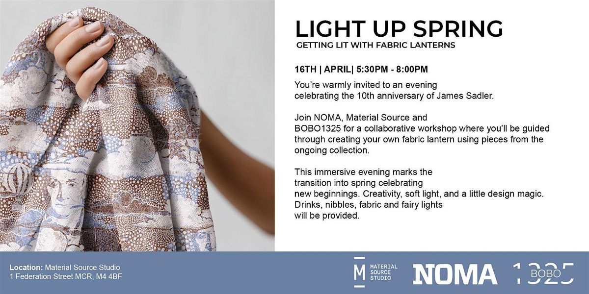 Join NOMA, Material Source, and BOBO1325 for a special collaborative workshop where you’ll be guided through creating your own fabric lantern using pieces from the ongoing collection in honour of James Sadler. This hands-on experience invites you to explore texture, colour and form, transforming carefully curated fabrics into a beautifully soft, while artist BOBO1325 shares the inspiration and thinking behind the designs.