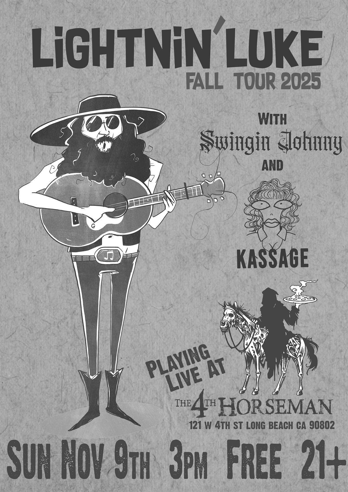 Lightnin' Luke ( Bridge City Sinners), Swingin Johnny & Kassage will be performing at The 4th Horseman Sunday Nov 9th at 3pm. Free Show. 21+
