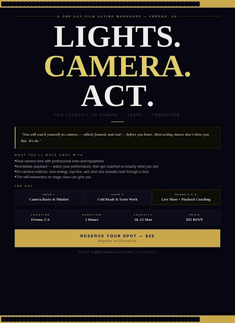 Lights. Camera. Act. is a one-day, on-camera acting intensive in Fresno, built around one core idea: you will see yourself on camera before you leave.