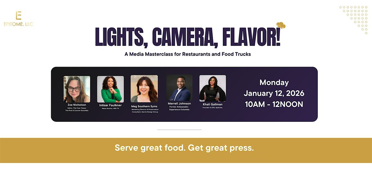 Welcome to Lights, Camera, Flavor! Join us for a media masterclass tailored for restauranteurs, food truck operators, and food-based small businesses on January 12, 2026 at 10:00 AM at the Girl Scouts of South Carolina - Mountains to Midlands. Get ready to learn how to showcase your culinary creations like a pro! Don't miss this opportunity to elevate your restaurant's presence and attract more customers.